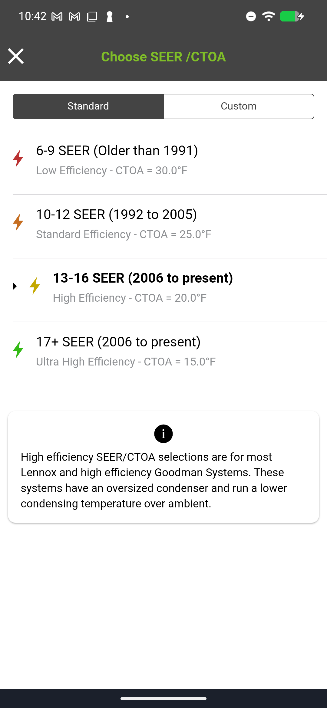 Next, tap the SEER field to open the Choose SEER/CTOA screen. The app groups efficiency into four ranges: