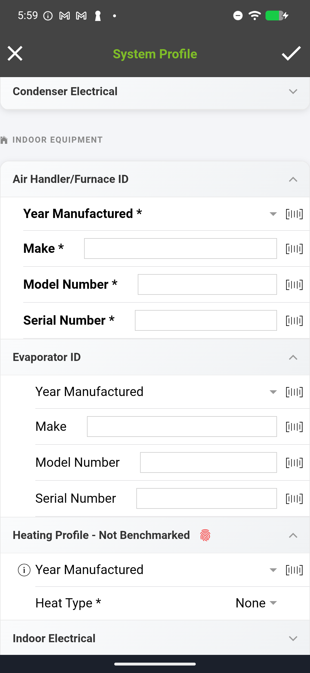 The condenser nameplate scan is particularly important because it determines the manufacturer, refrigerant type, and SEER rating for the system. If you scan both the indoor and outdoor nameplates, the system profile merges the data from both pieces of equipment.