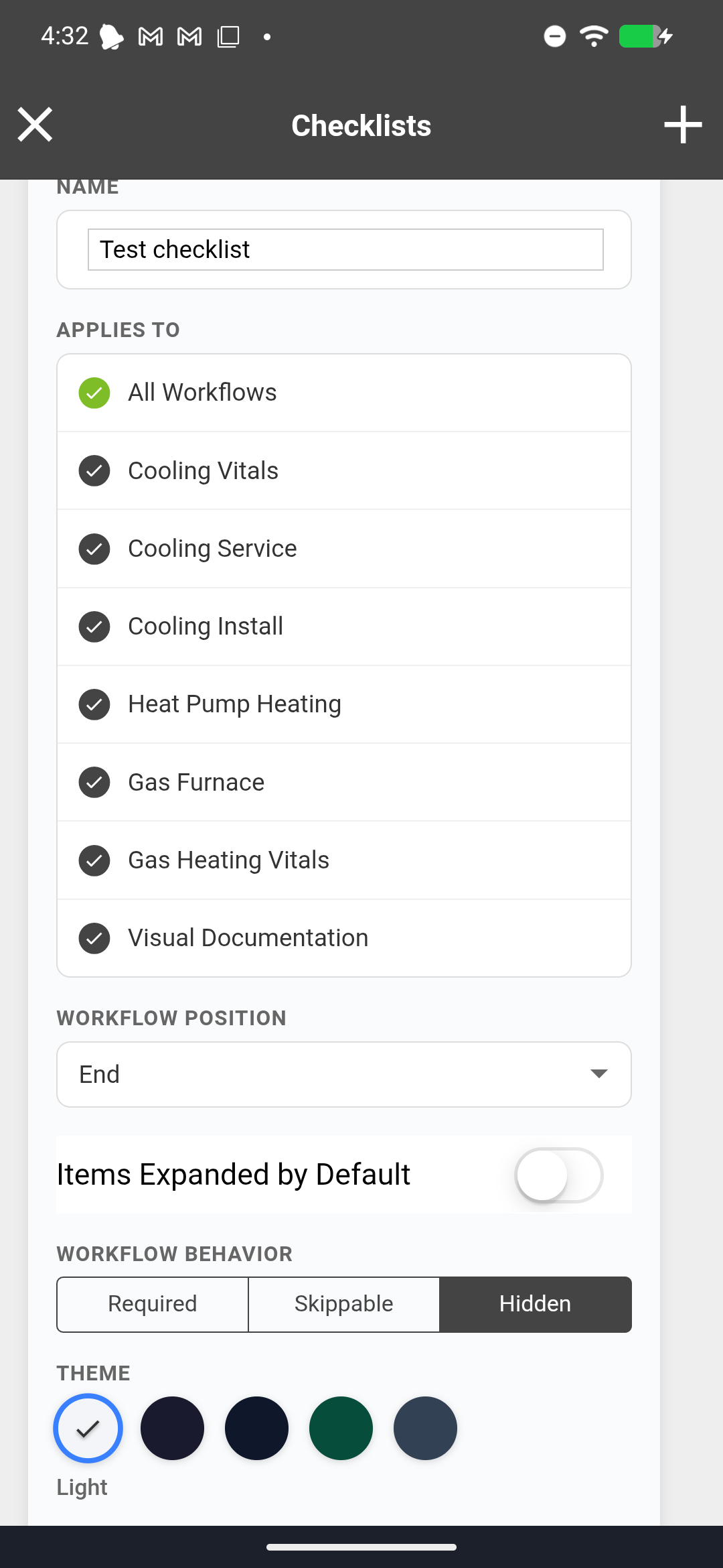 A toggle controls whether the checklist appears expanded (all items visible) or collapsed (header only, technician taps to expand) when it first appears in the workflow. For short checklists (3-5 items), expanded is usually better. For longer checklists (10+ items), collapsed keeps the screen manageable.