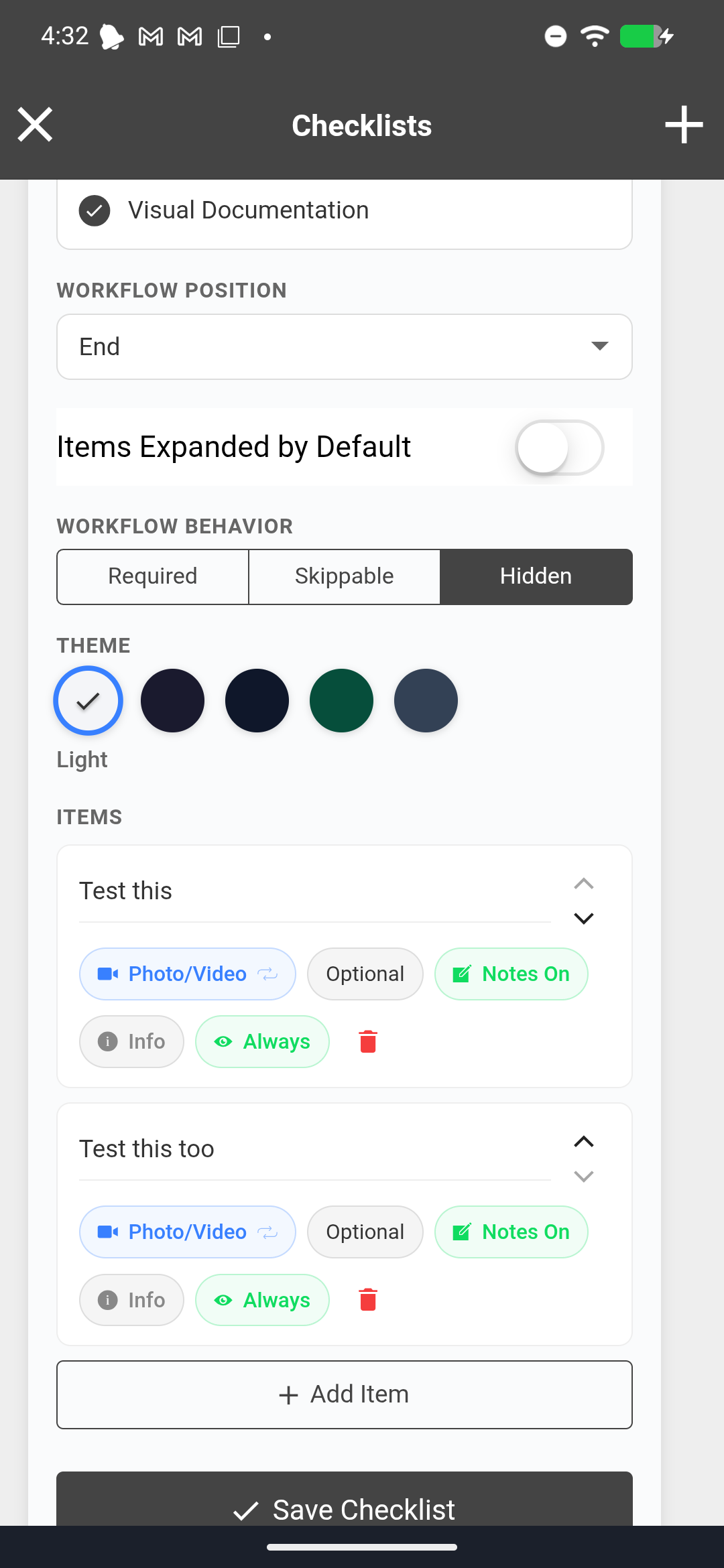 Checklist builder showing Workflow Behavior buttons (Required, Skippable, Hidden) and the Items Expanded by Default toggle