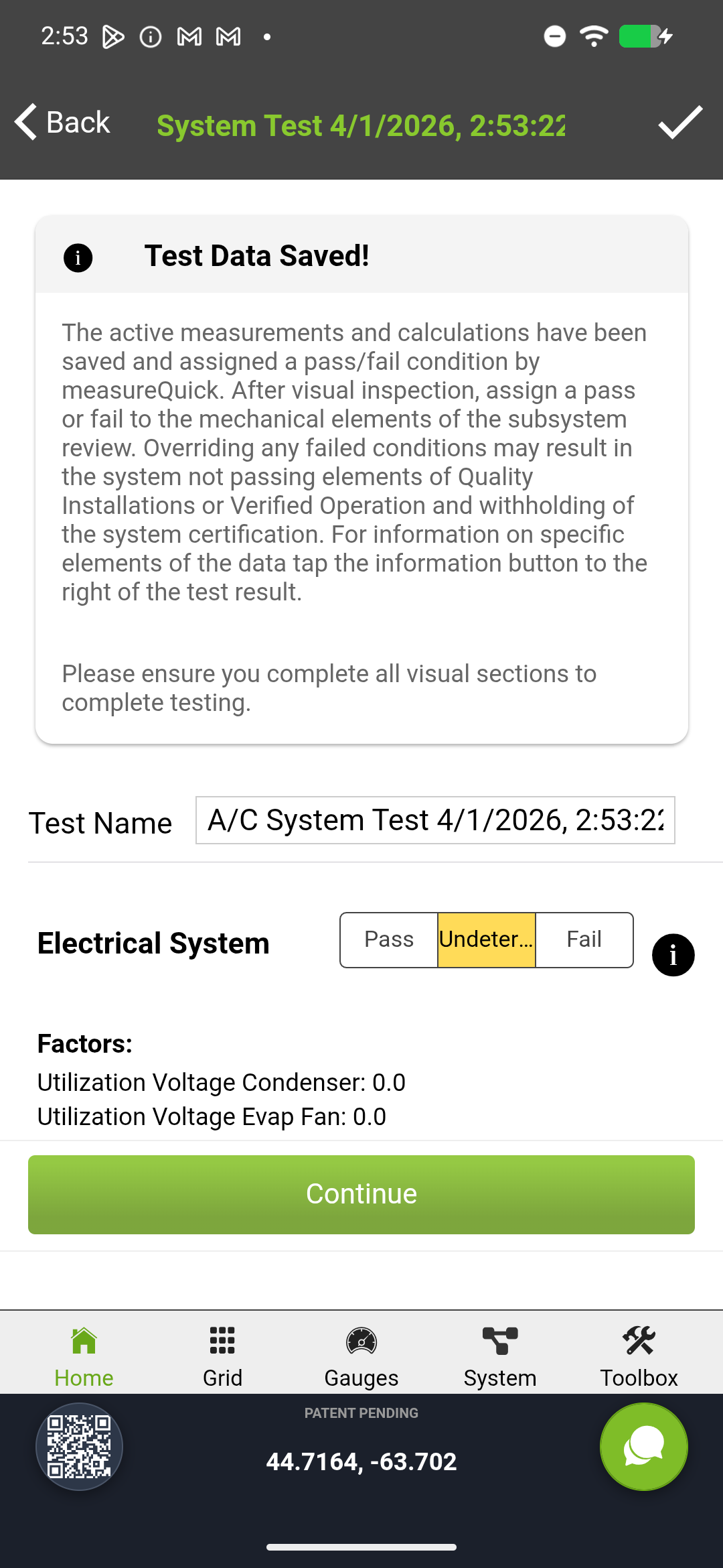 If the electrical subsystem fails, the pass/fail indicator (pf_electrical_result) turns red. You can tap the electrical section to see which specific condition triggered the failure - voltage, amperage, or a combination.