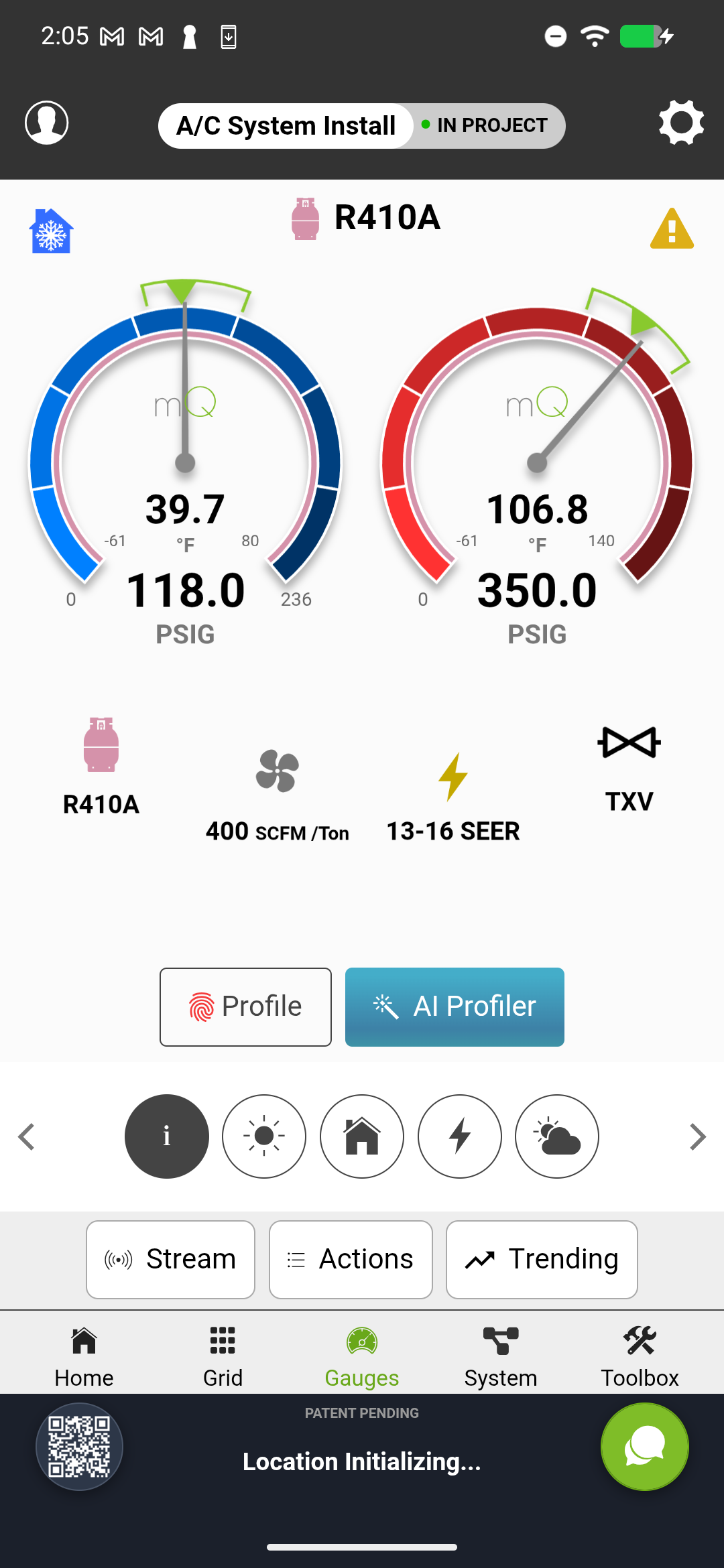 When a manifold connects, pressure data populates the diagnostic screen in real time: