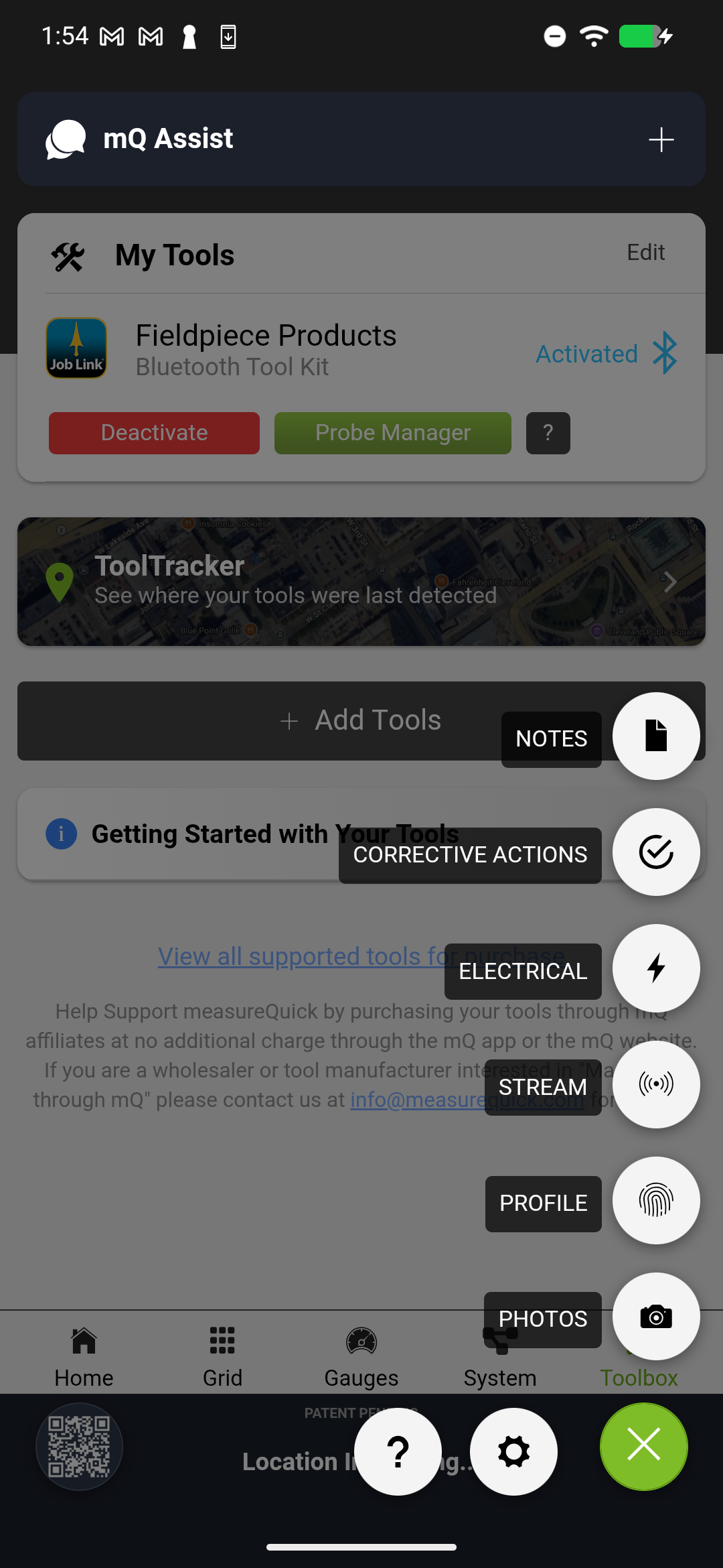 mQ+ floating button expanded showing Notes, Corrective Actions, Electrical, Stream, Profile, and Photos shortcuts