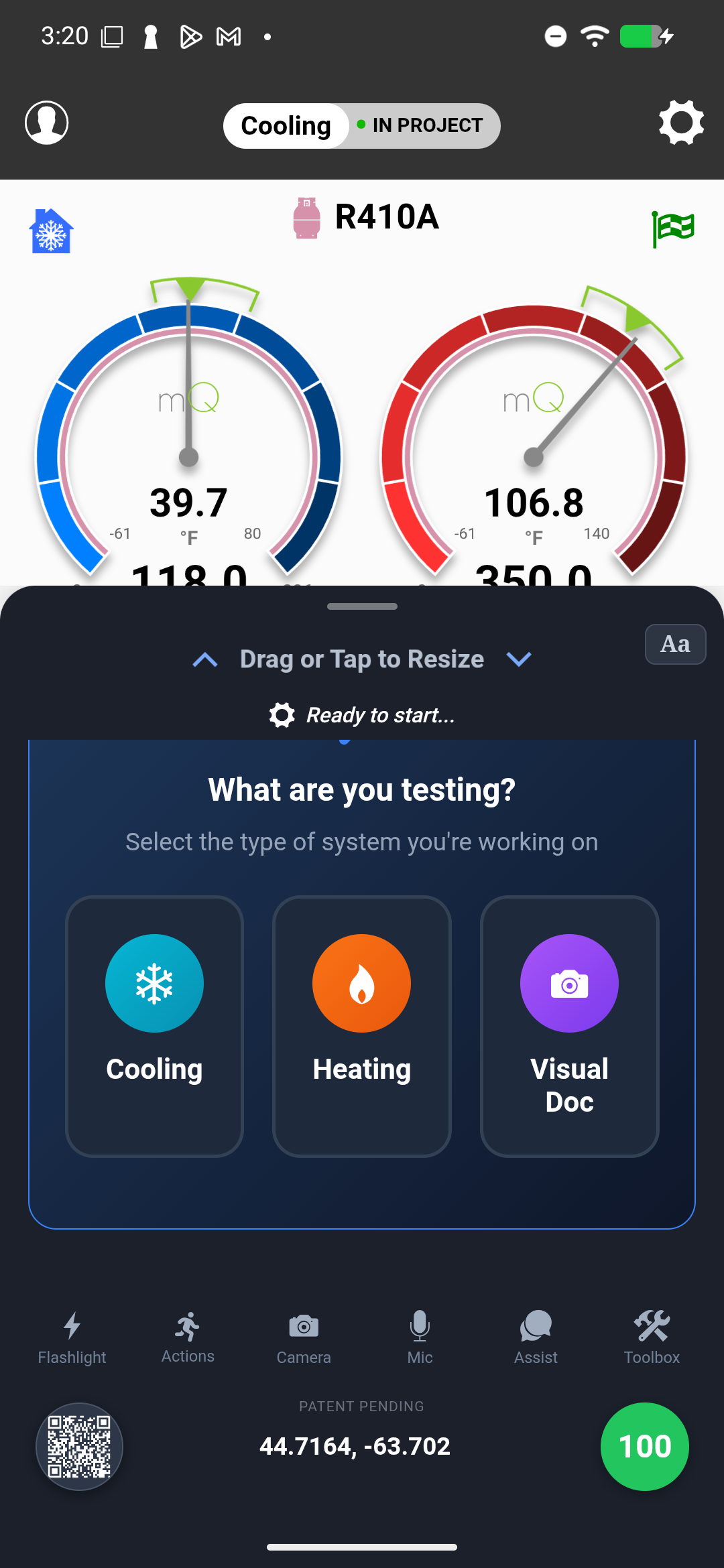 Test screen showing "Cooling - IN PROJECT" header with gauge display and system type selection for Cooling, Heating, and Visual Doc
