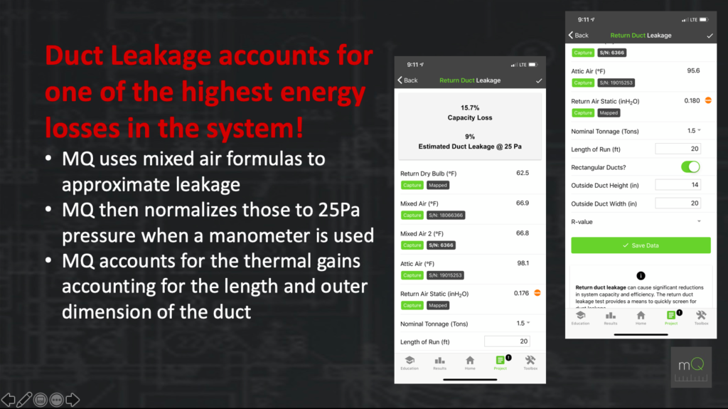 The more information that you supply mQ such as the return duct length, the duct diameter or circumference, and the R-Value of the exterior insulation, the more accurately mQ can estimate the duct leakage.