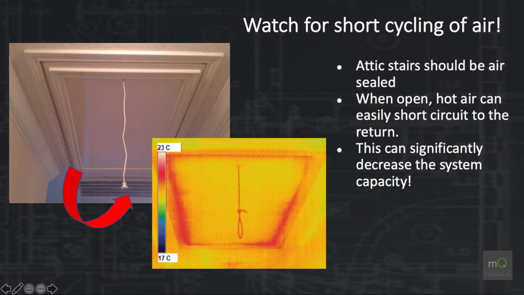 When performing this testing, make sure that you are not short cycling air from an attic access into the return air grill. If the return air temperature is more than a degree or two above what the thermostat is registering you may want to use painters tape to temporary seal the attic access to see if the duct leakage goes away. While this is not leakage into the duct from the attic, it is an unintentional path of leakage into the return that will significantly reduce the capacity of the cooling system. There are many attic stair solutions available that will eliminate this issue.